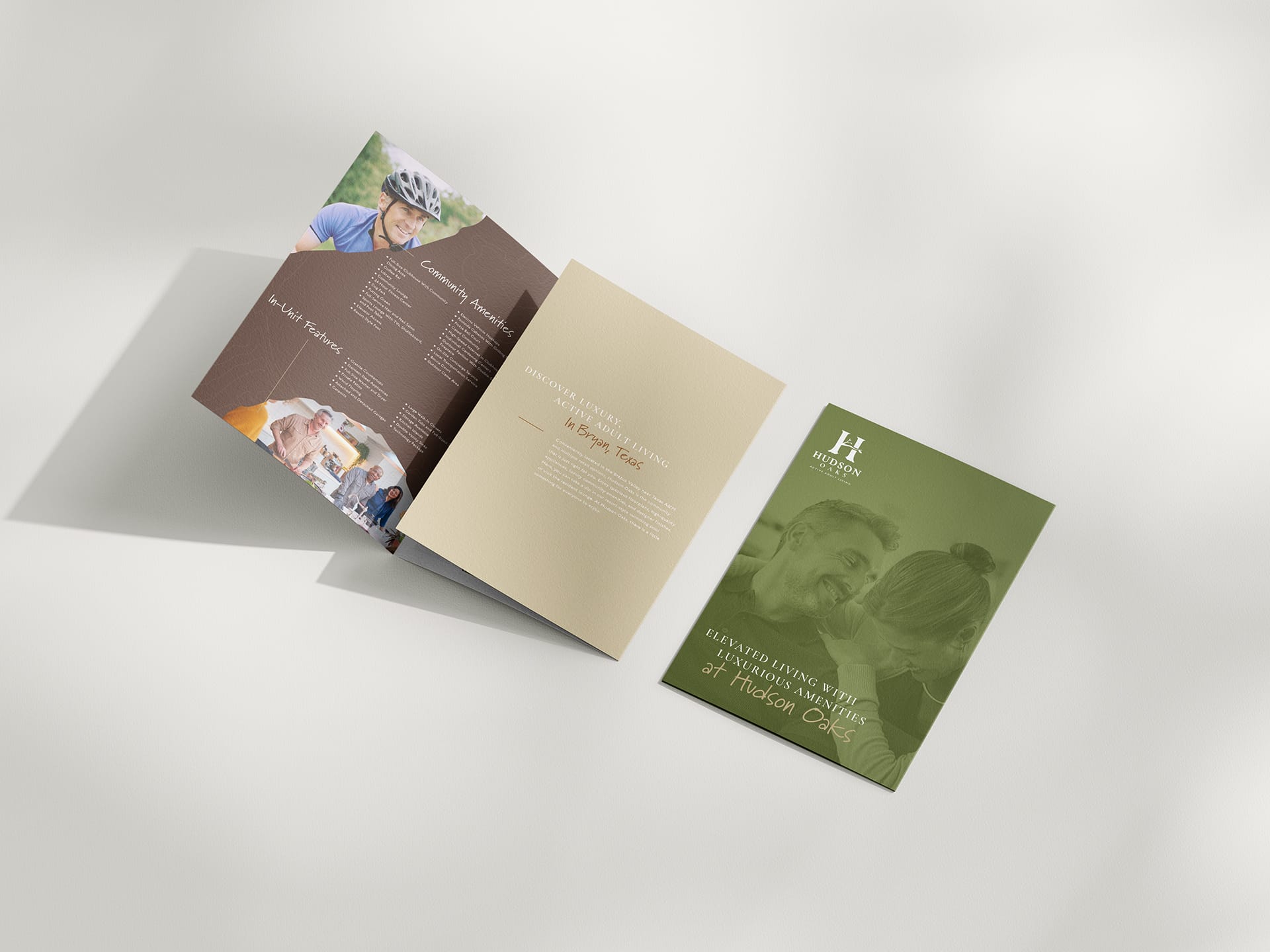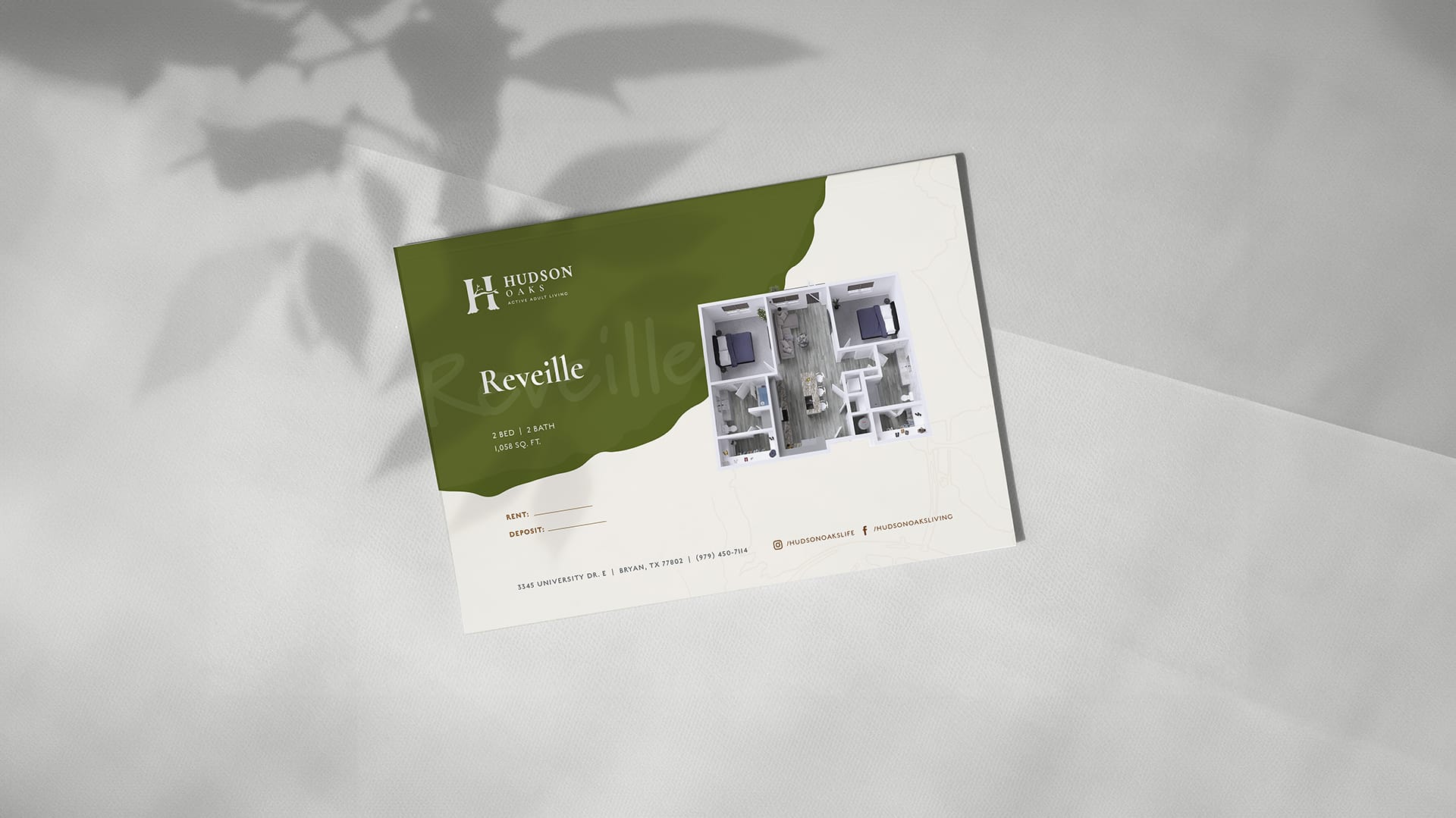 NE Management recently tasked us with branding Hudson Oaks, an active adult community in Bryan/College Station, TX. The project’s focal point was developing a logo that resonated with the community’s rustic modern decor and natural surroundings.