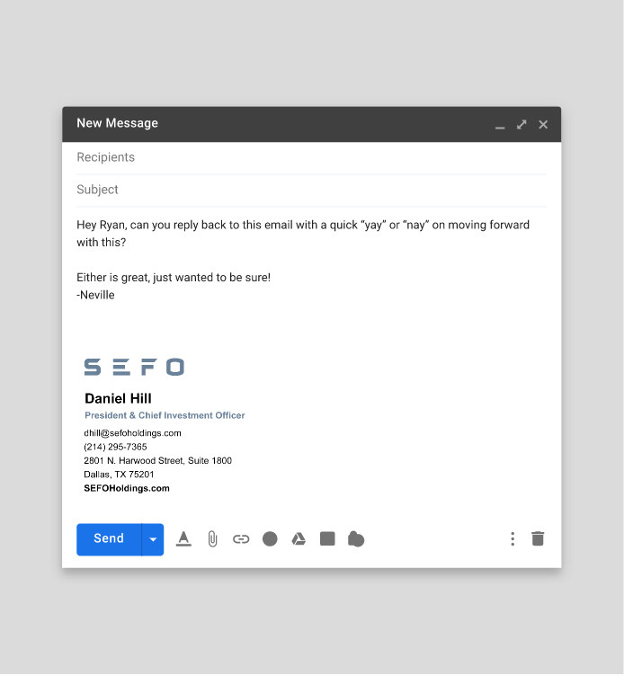 To empower SEFO Holdings, a Dallas-based family office known for its innovative approach to alternative investing, we crafted a comprehensive brand identity package. These brand assets included essential collateral materials, email signatures, a professional PowerPoint template, and optimized LinkedIn assets to help SEFO communicate its value proposition to potential partners and investors.
